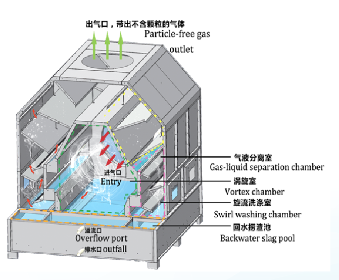含有漆霧、漆渣、油雰、粉塵的有機廢氣被排風機高速吸入設備,通過渦旋室的離心カ, 進入旋流洗條室, 使廢氣的濃度和粘度降低,經處理的廢氣再進入氣液分離室。再離心力的作用下,漆雰、漆渣、油雰、粉塵等顆粒物從混合廢氣中分離出來,碰到水膜上被收集。分離出的有機廢氣(通過離心力甩干后,已經和正??諝獾臐穸纫粯?)進入到后端的廢氣處理系統,分離出的水則被擋水板阻隔,通過排渣口返回到水箱,廢渣回落到回水槽被收集至后部回水撈渣池中。在高速返回沖去力的作用下 ,漆雰形成類似泡沫狀的漆渣漂浮在回水撈渣池水面上,通過定期清除漆渣達到凈化水從而使水達到持續循環利用的目的。